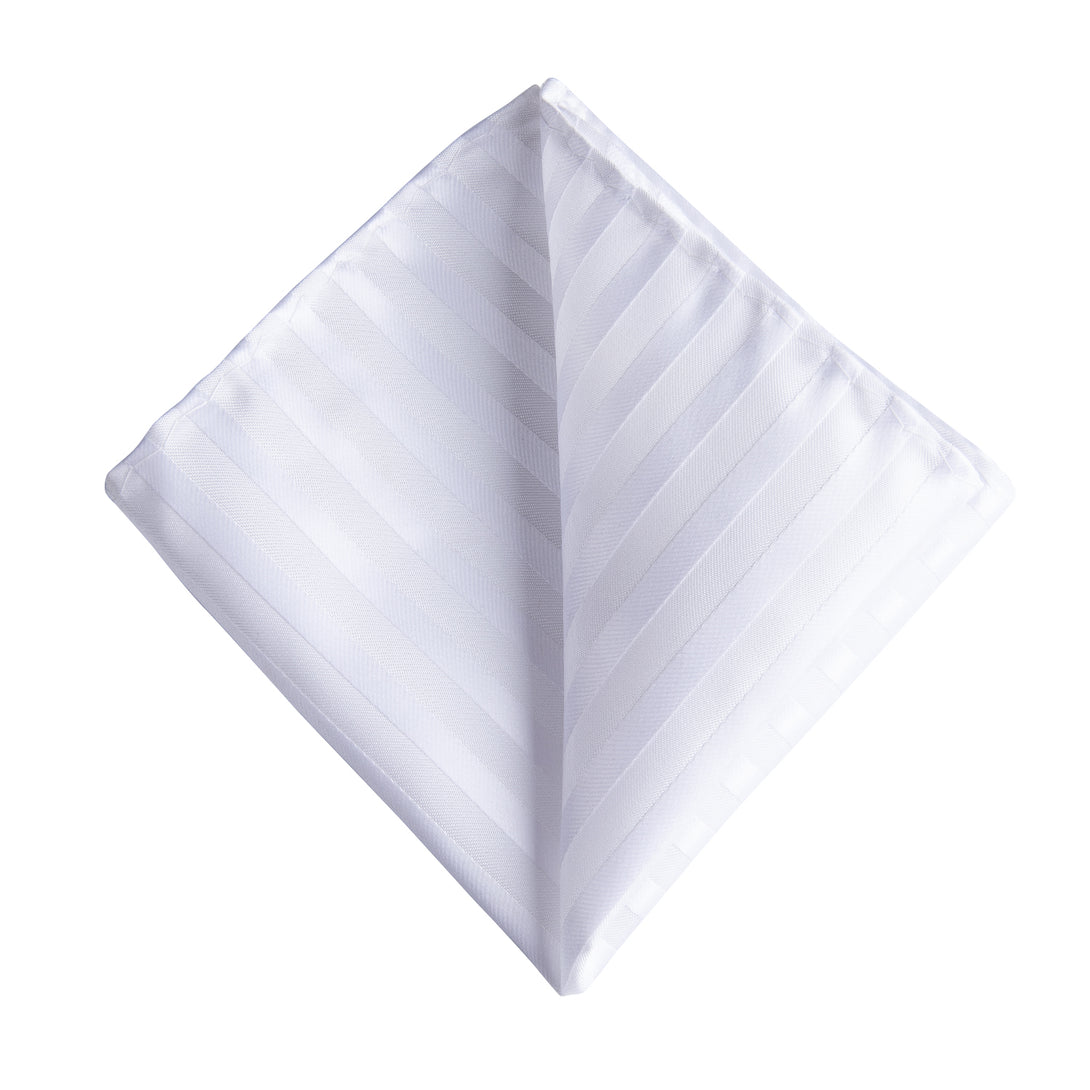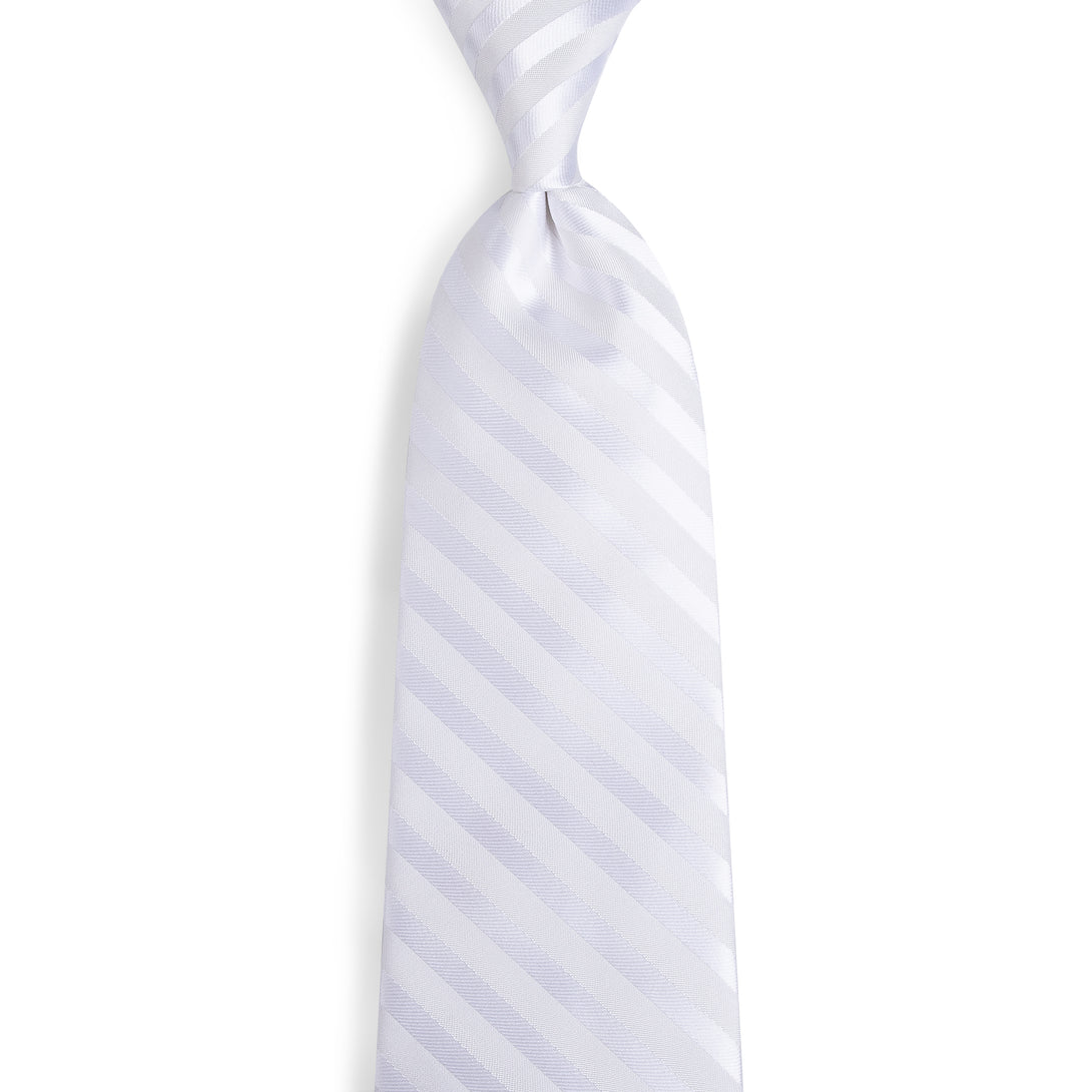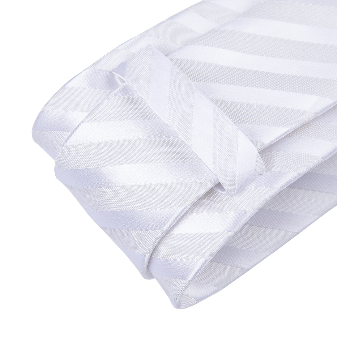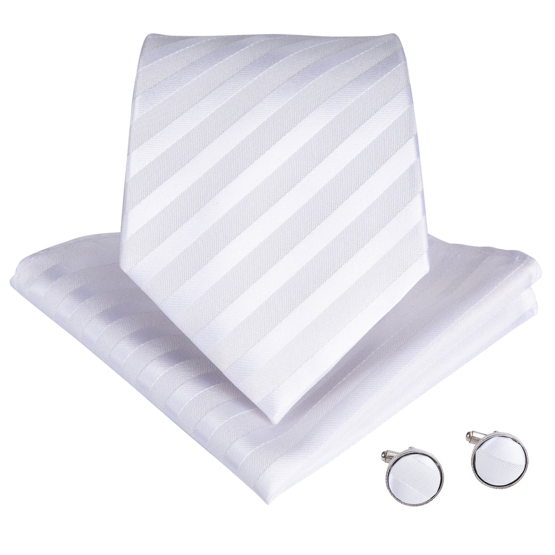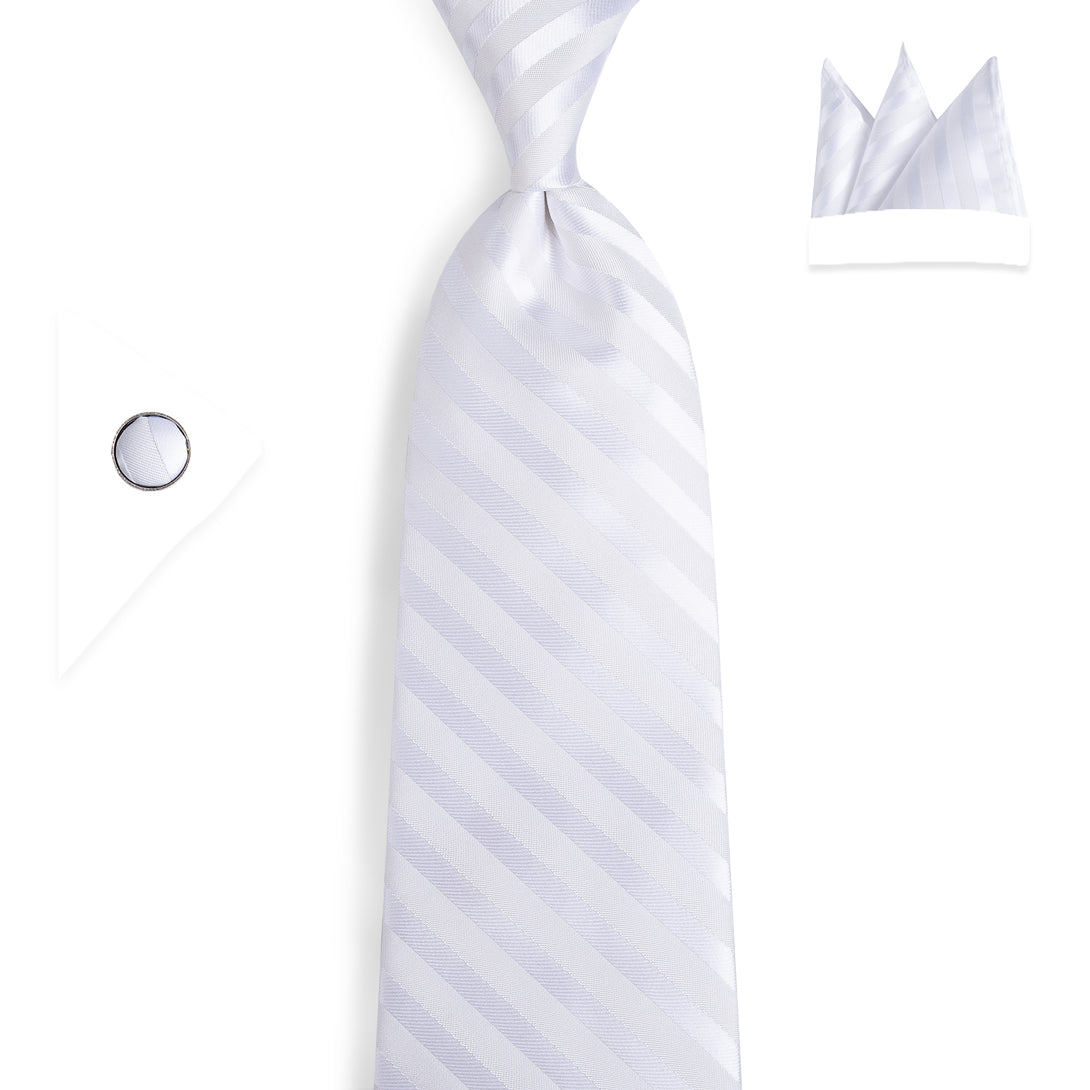 Silver White Striped Silk Fabric Tie Hanky Cufflinks Set 8cm
