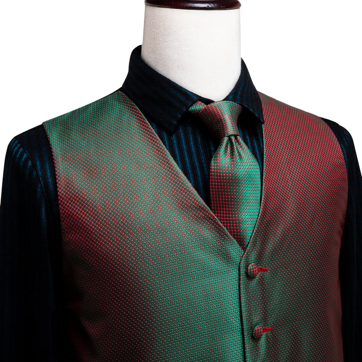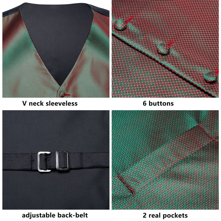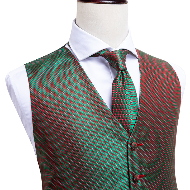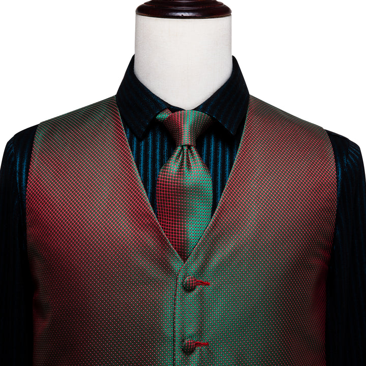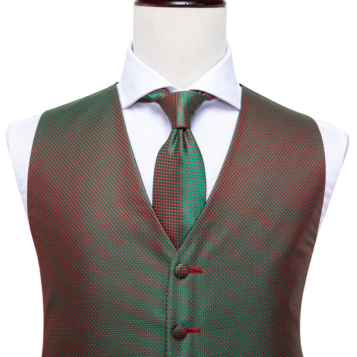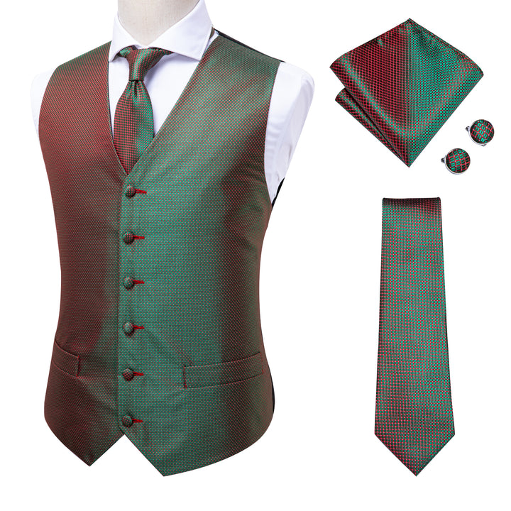 Simple Green Red Plaid Men's Vest Tie Hanky Cufflinks Set Waistcoat Suit Set