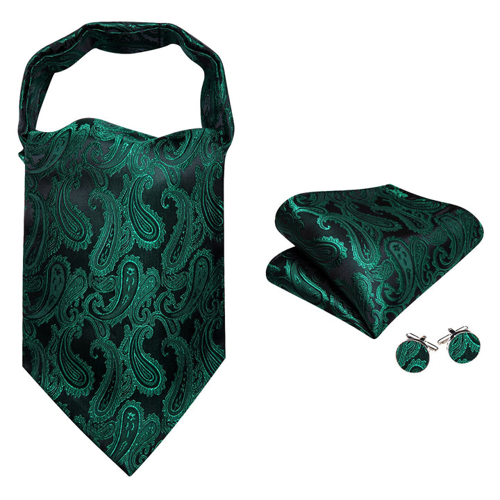 Sapphire Pine Green Paisley Silk Mens Ascot Tie Pocket Square Cufflinks Set