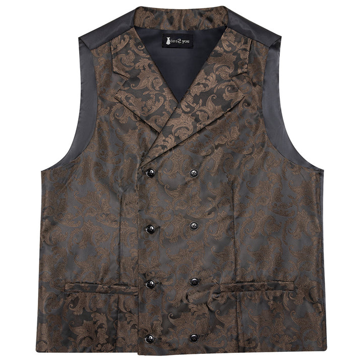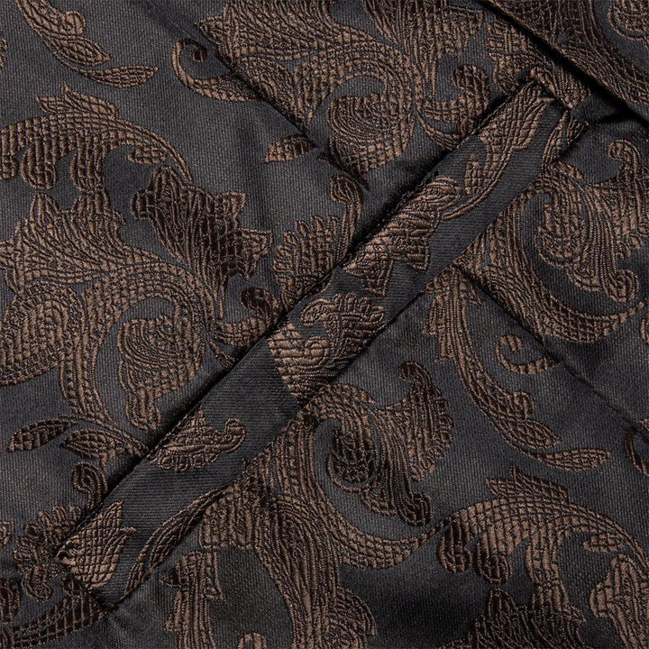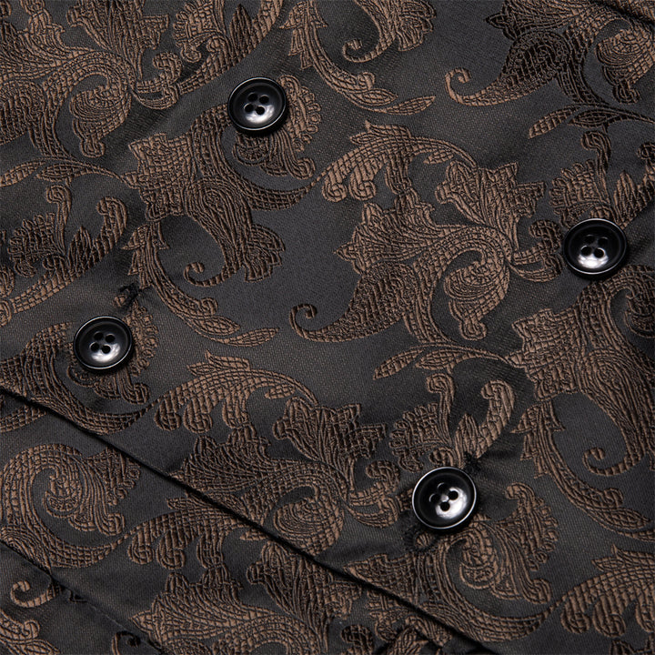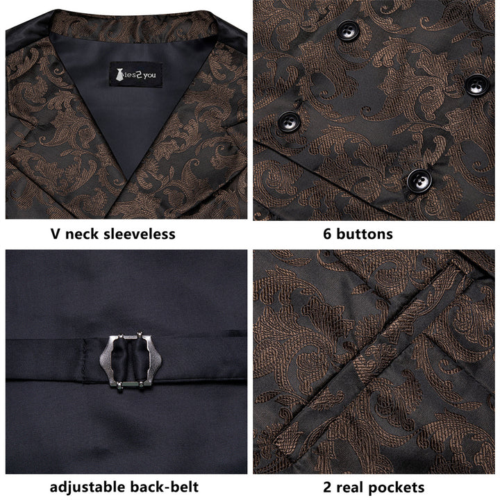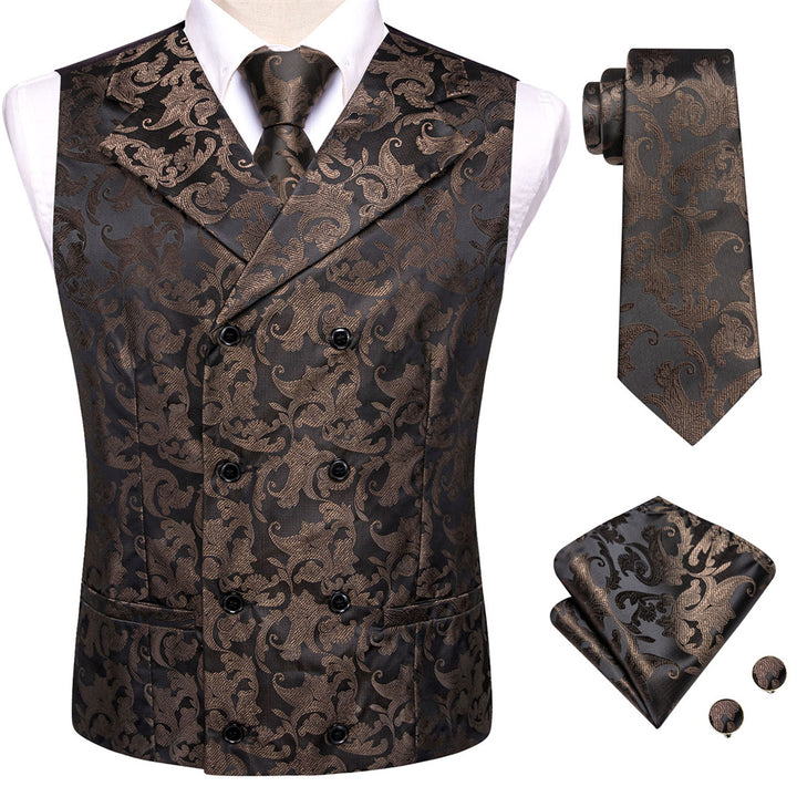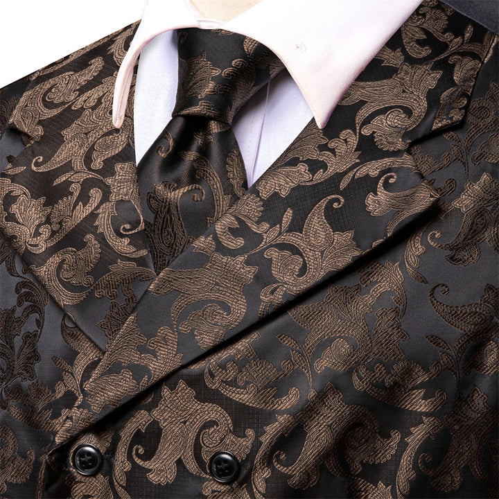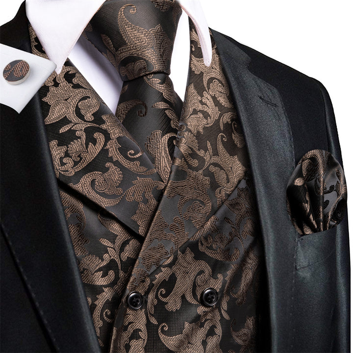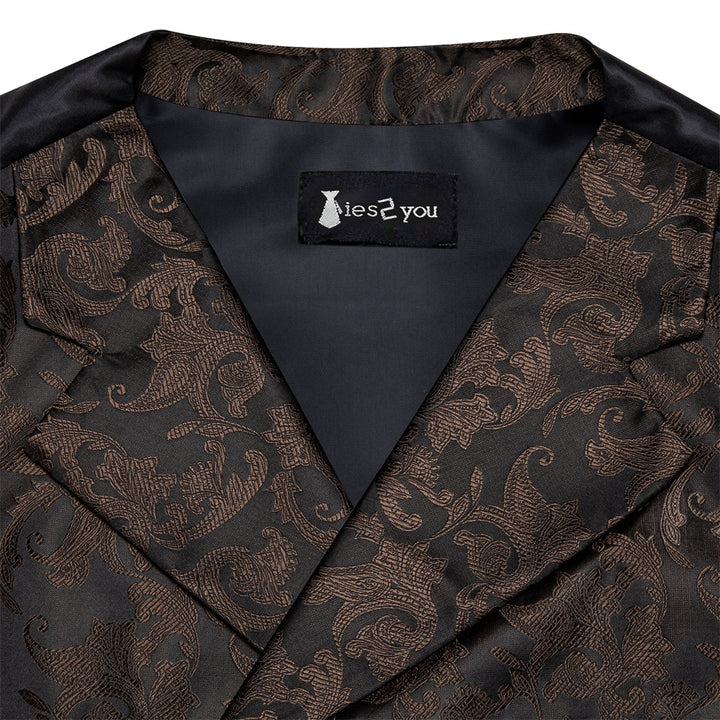 Ties2you Black Brown Floral Double Breasted Silk Mens Vest Hanky Cufflinks Tie Set