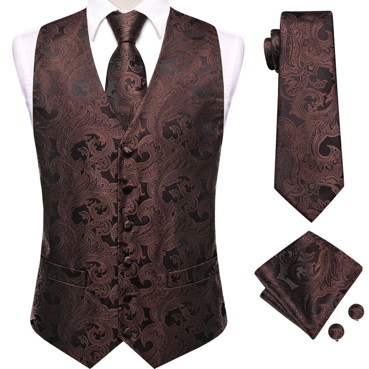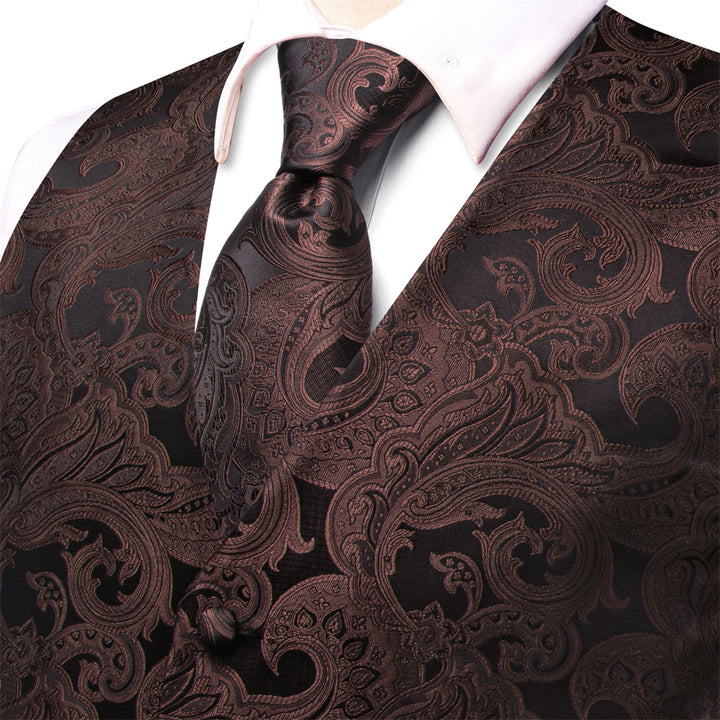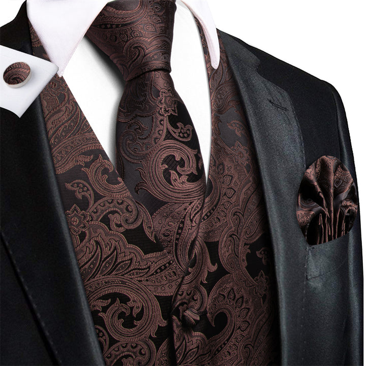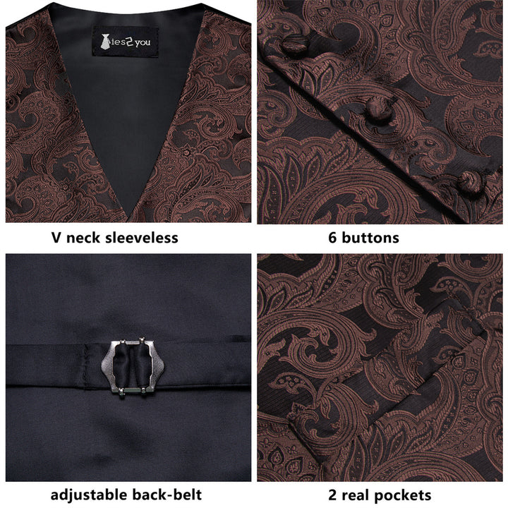 Ties2you Black Brown Paisley Pattern V-Neck Silk Vest Necktie Set