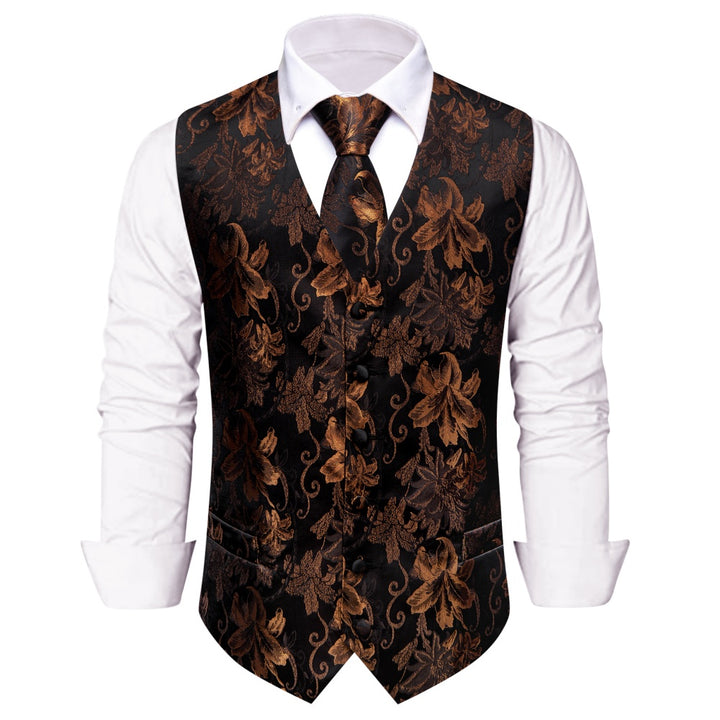 Ties2you Black Brown V-Neck Waistcoat Mens Floral Vest Necktie Set