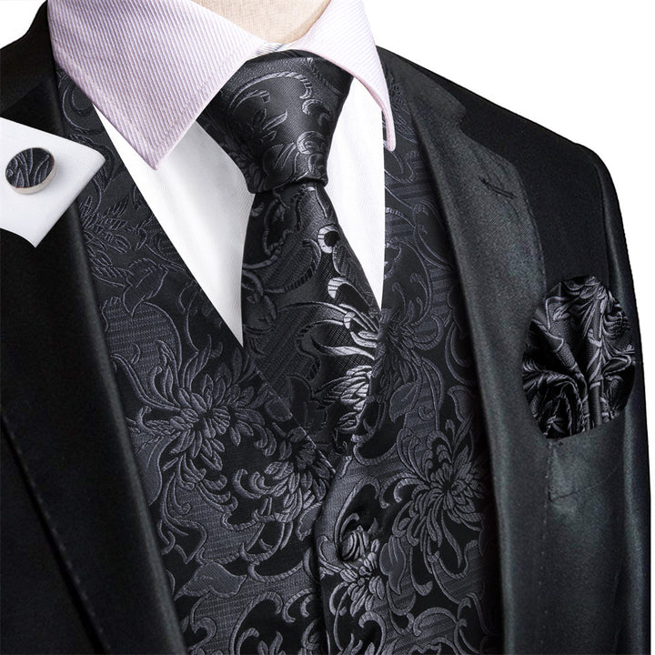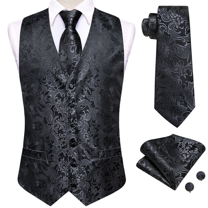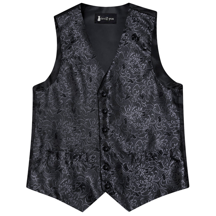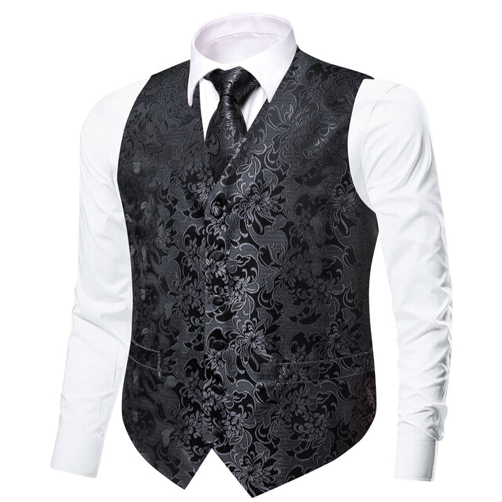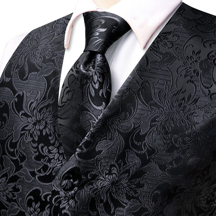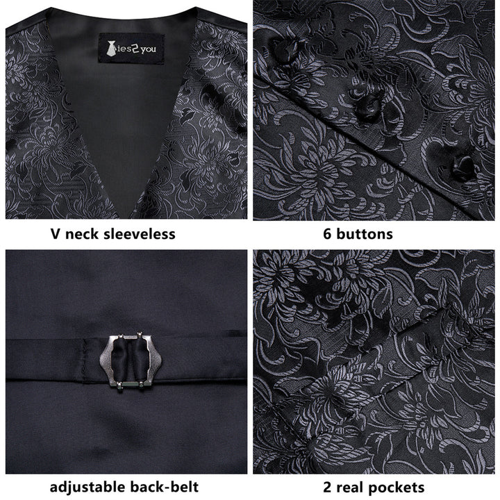 Ties2you Black Floral Pattern V-Neck Silk Vest Necktie Set