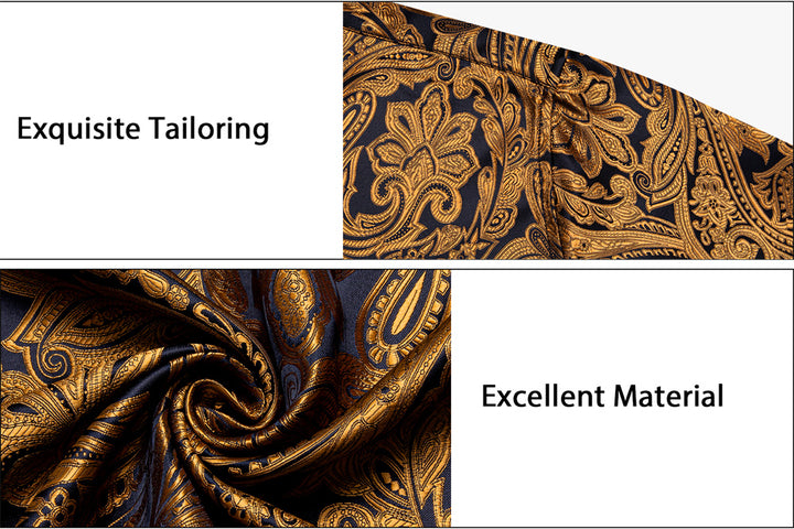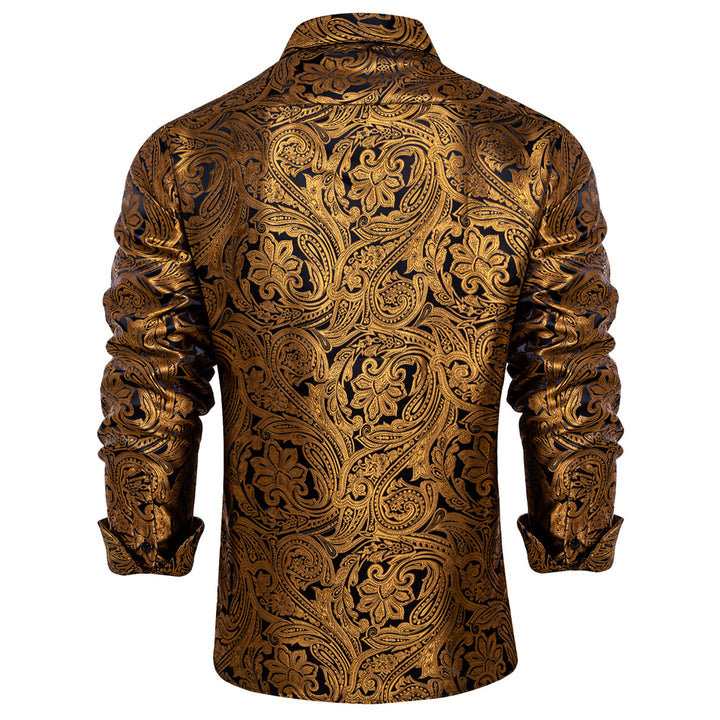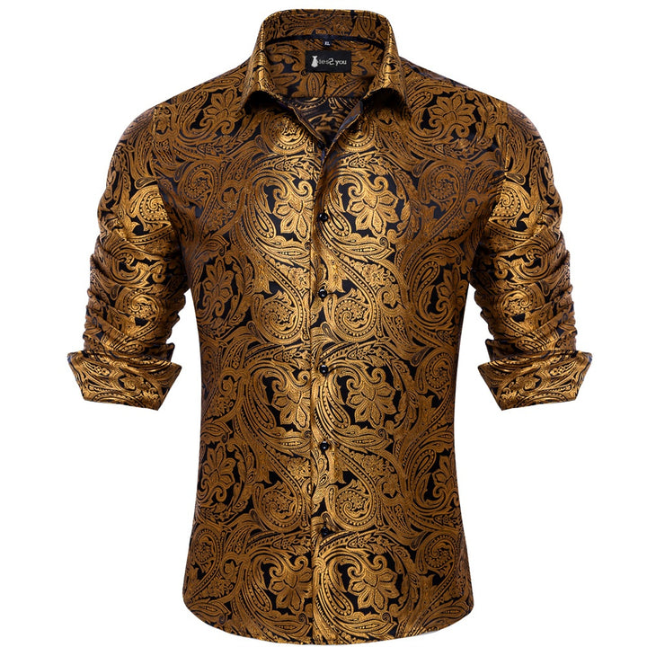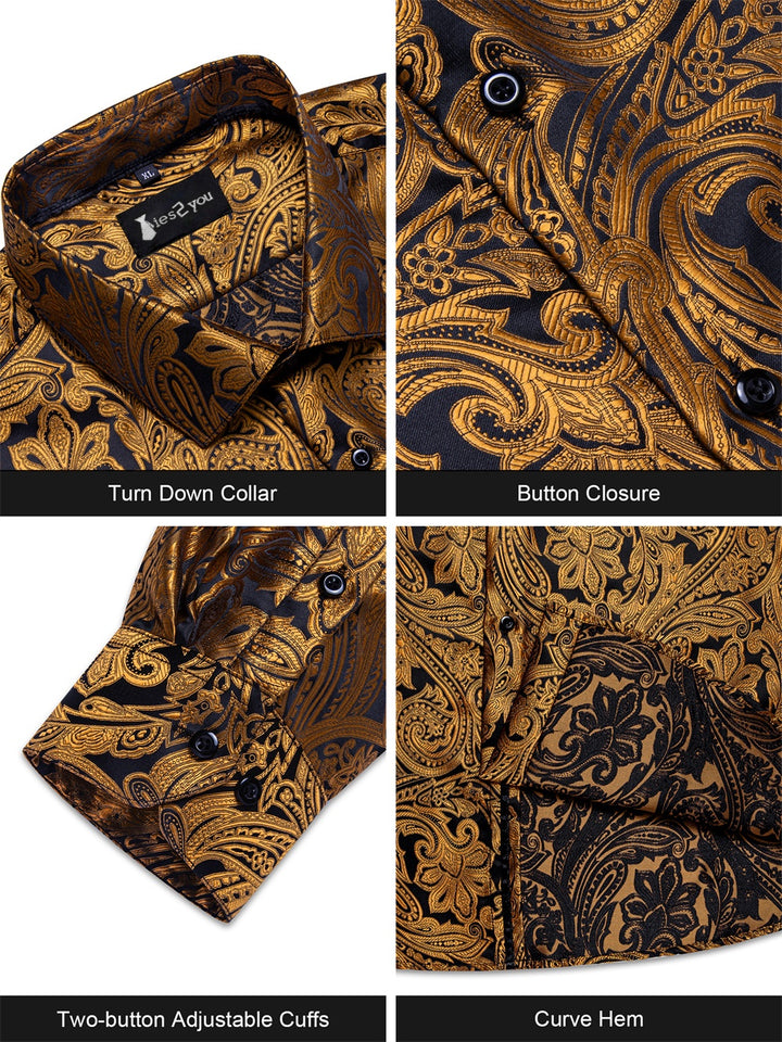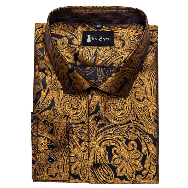 Ties2you Black Gold Paisley Button Up Silk Long Sleeve Men's Shirt