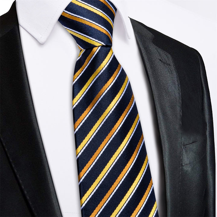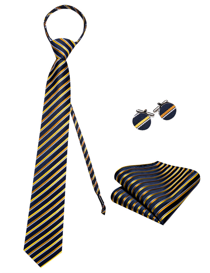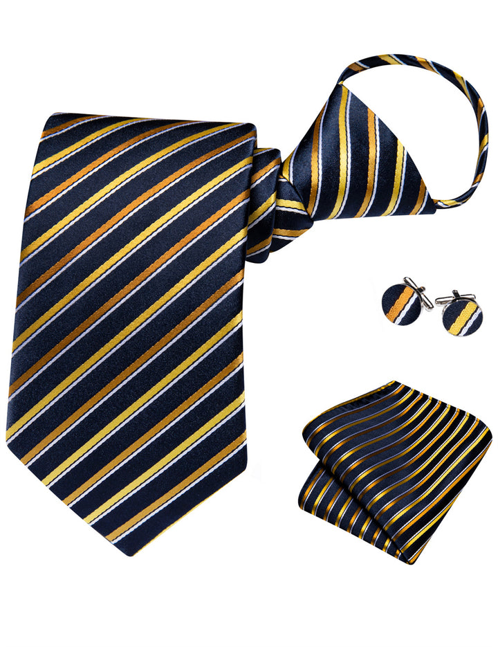 Ties2you Black Golden Striped Lazy Mens Business Easy-pull Silk Tie Pocket Square Cufflinks Set