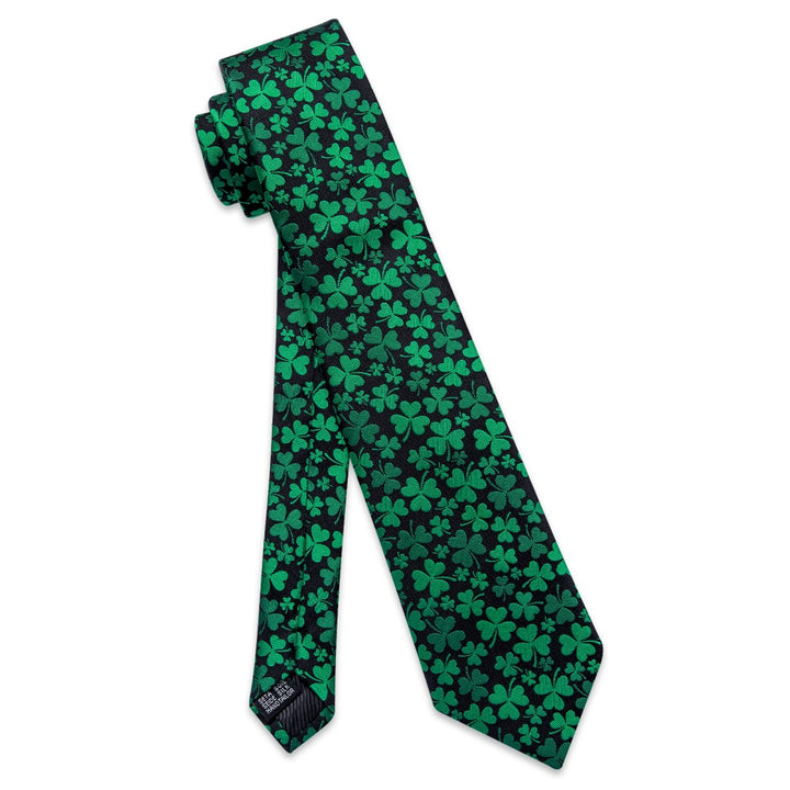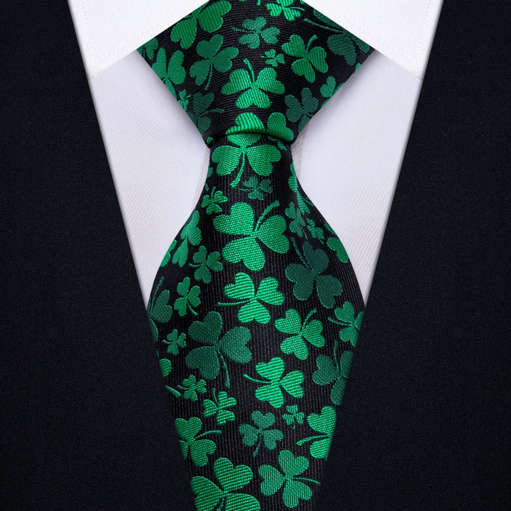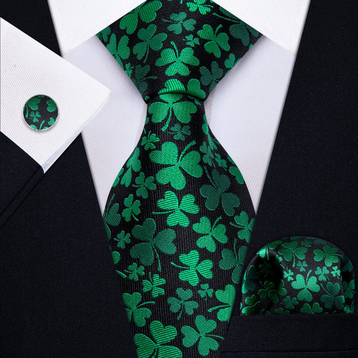 Ties2you Black Green Clover Botanical Men's Necktie Pocket Square Cufflinks Set