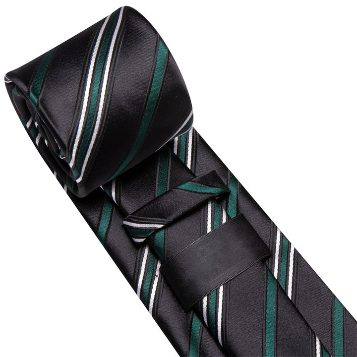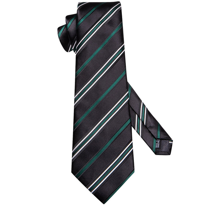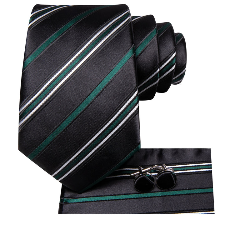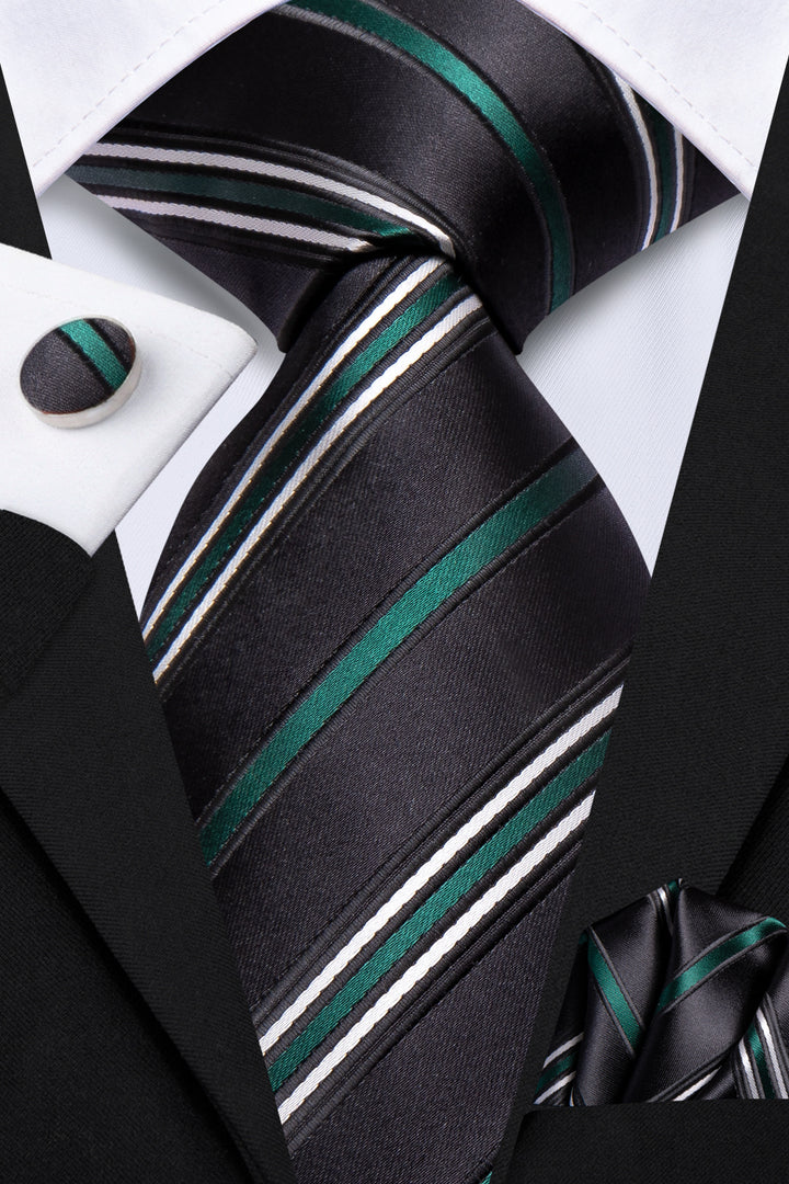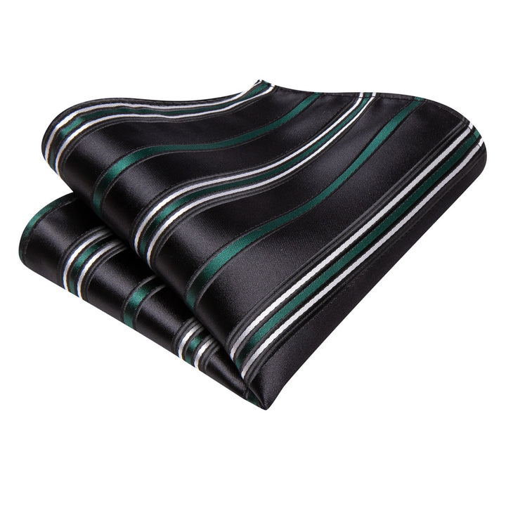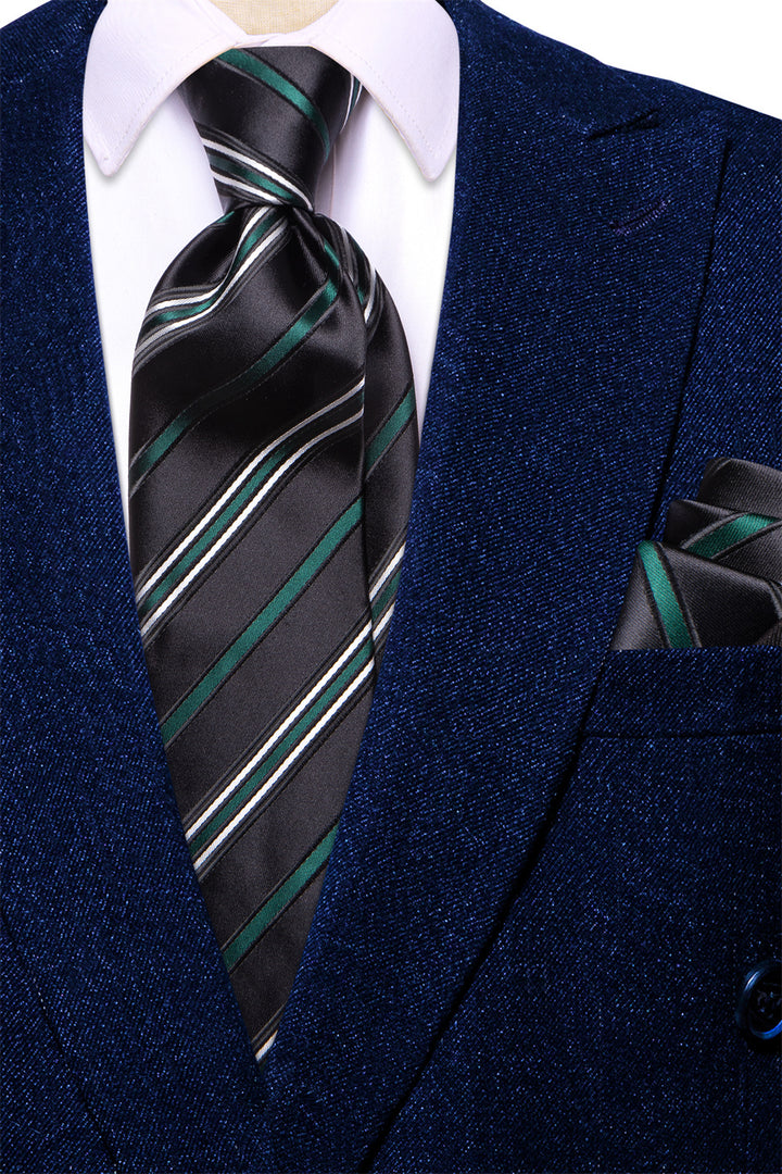 Ties2you Black Green Striped Men's Necktie Hanky Cufflinks Set