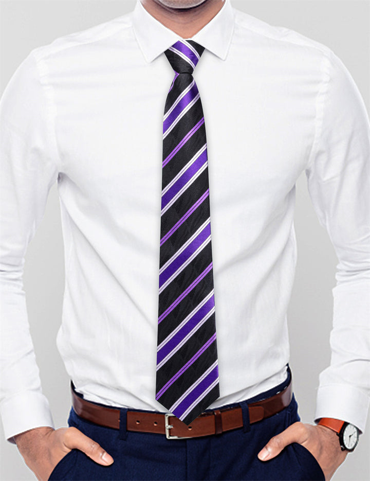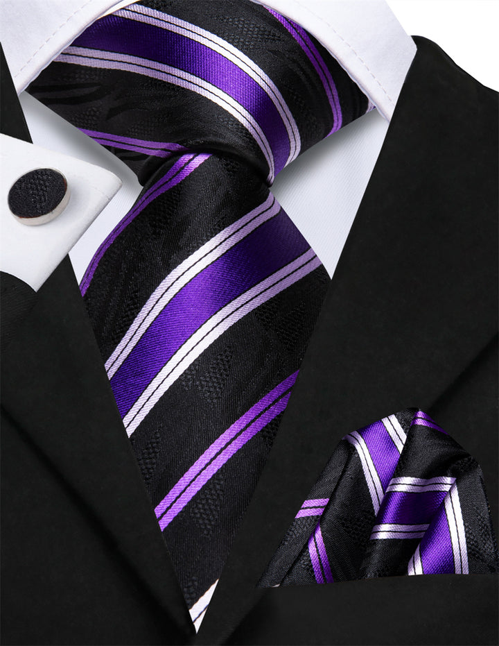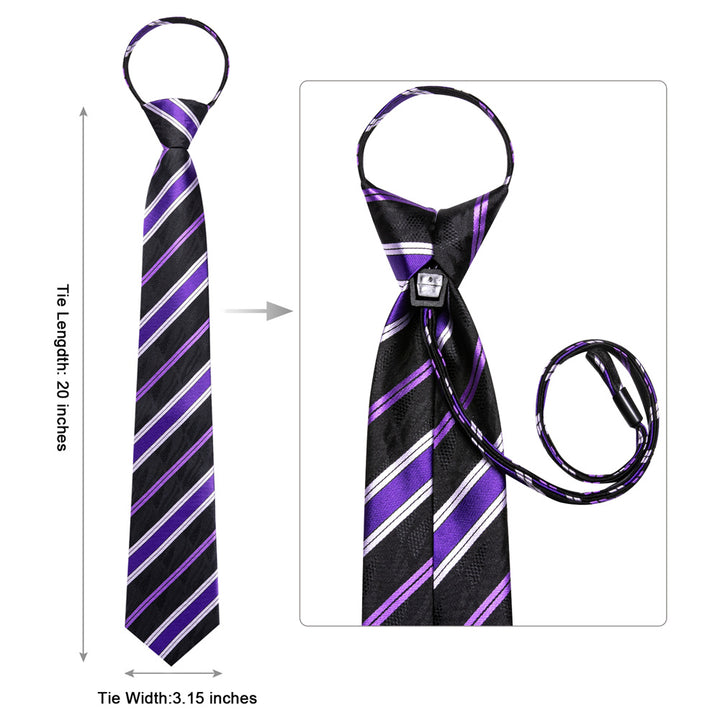 Ties2you Black Purple Striped Lazy Mens Business Easy-pull Silk Tie Pocket Square Cufflinks Set
