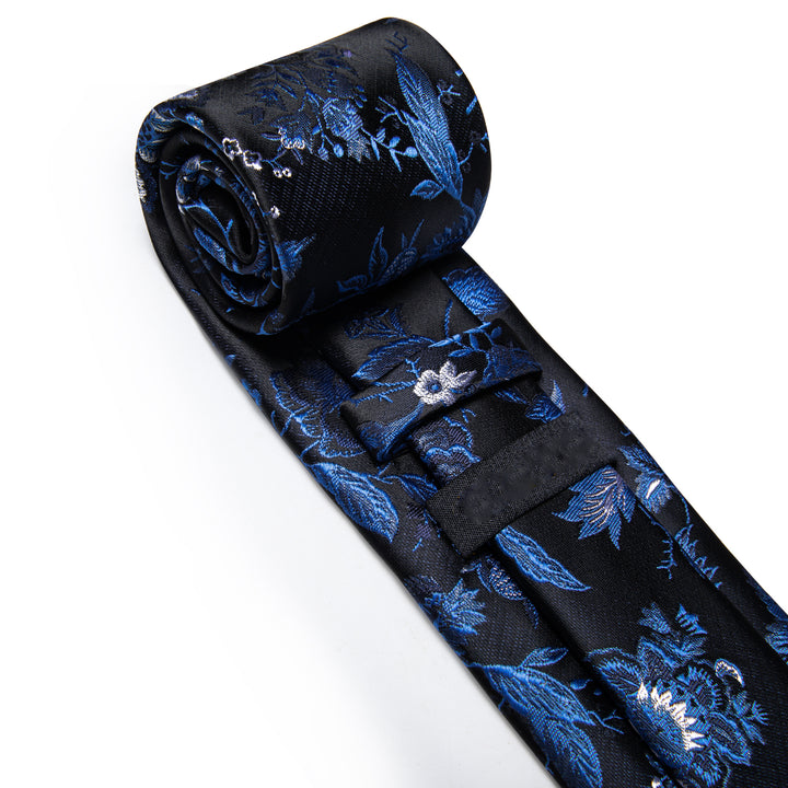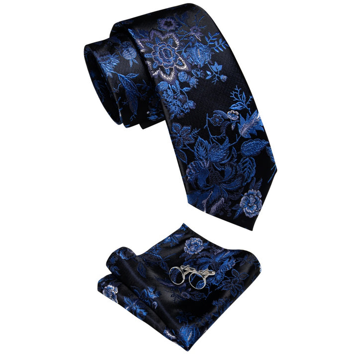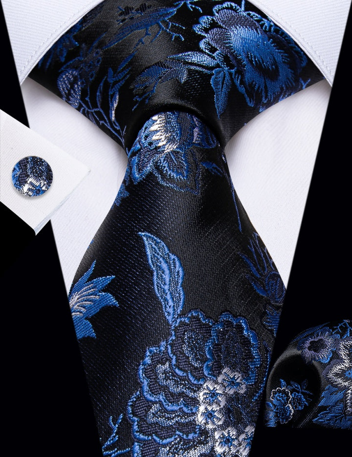Ties2you Blue Black Floral Men's Necktie Pocket Square Cufflinks Set