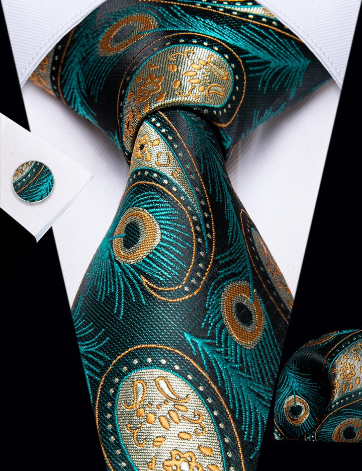 Ties2you Blue Green Yellow Paisley Feather Men's Necktie Pocket Square Cufflinks Set