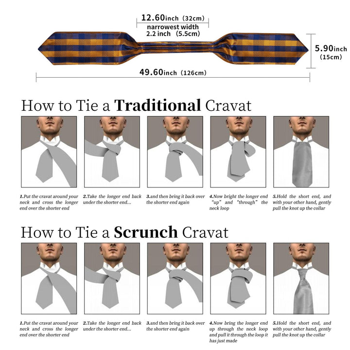 Regular Size: Ascot: 6.1" (15.5cm) wide, 2.17" (5.5cm) broad, 49.6" (126cm) length; Pocket Square: 9" x 9" (23cm x 23cm)