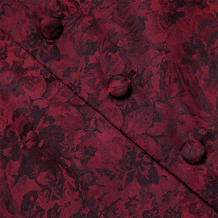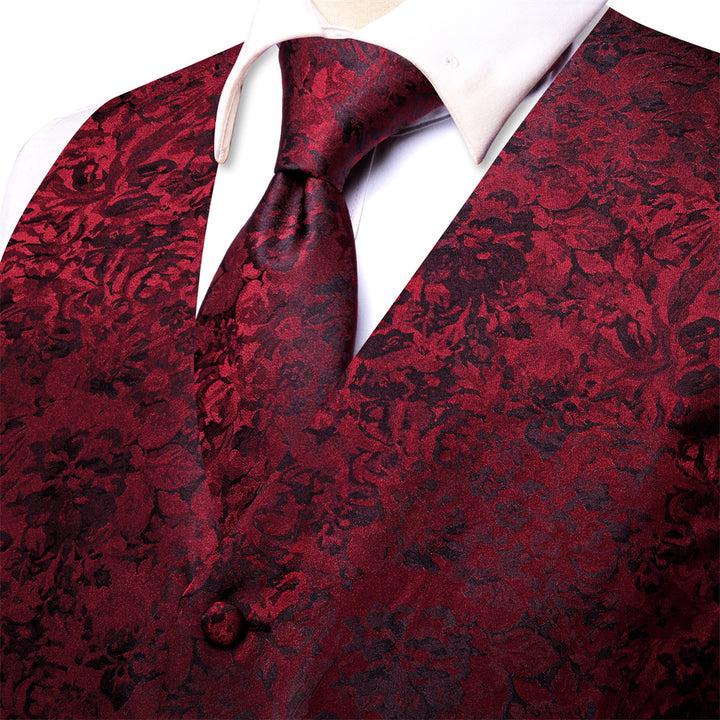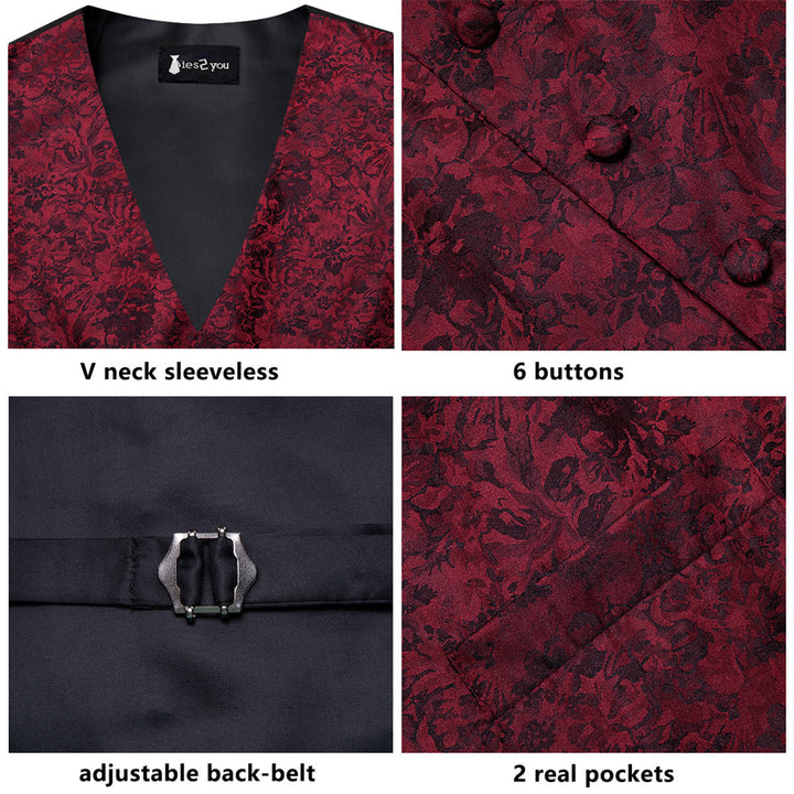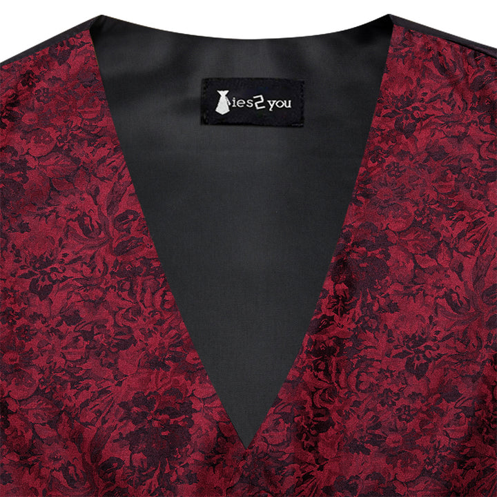 Ties2you Burgundy Floral Pattern V-Neck Silk Vest Necktie Set