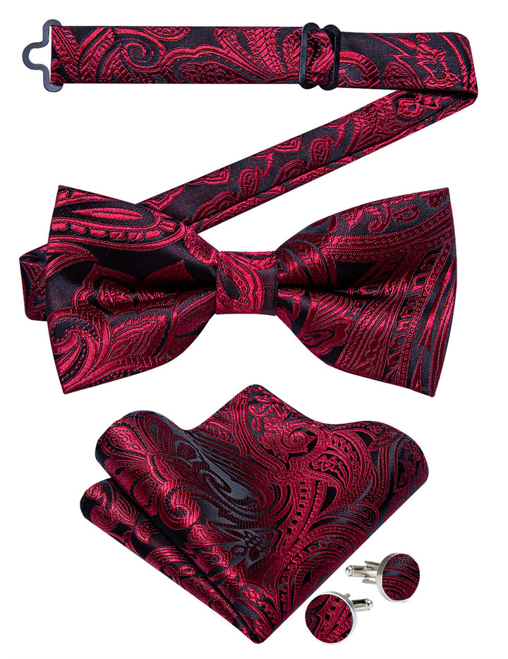 Ties2you Burgundy Paisley Pre-tied Bow Tie Pocket Square Cufflinks Set For Dress