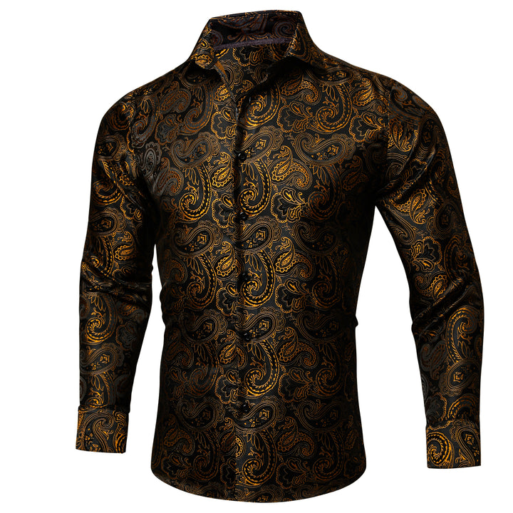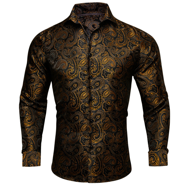Ties2you Button Down Shirt Black Gold Jacquard Paisley Silk Men's Long Sleeve Shirt
