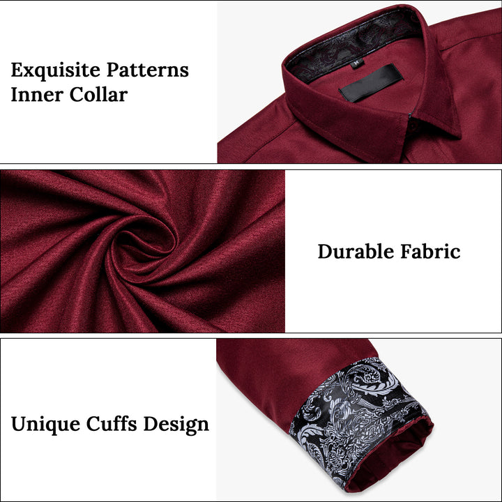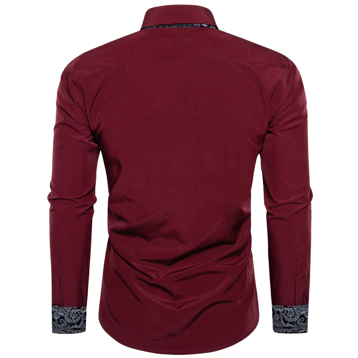 Button Down Shirt Burgundy Black Paisley Stitching Silk men dress shirt