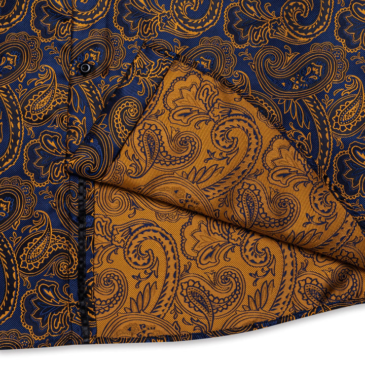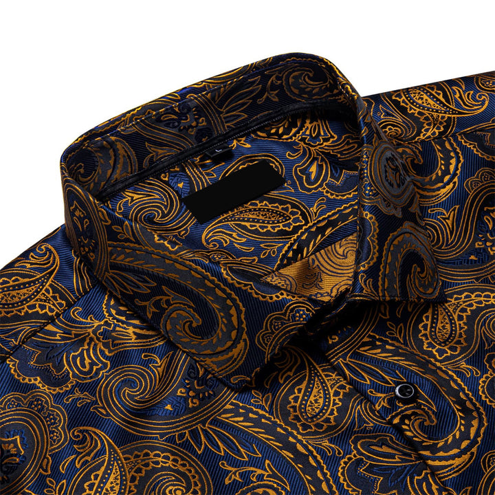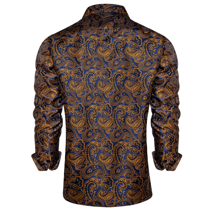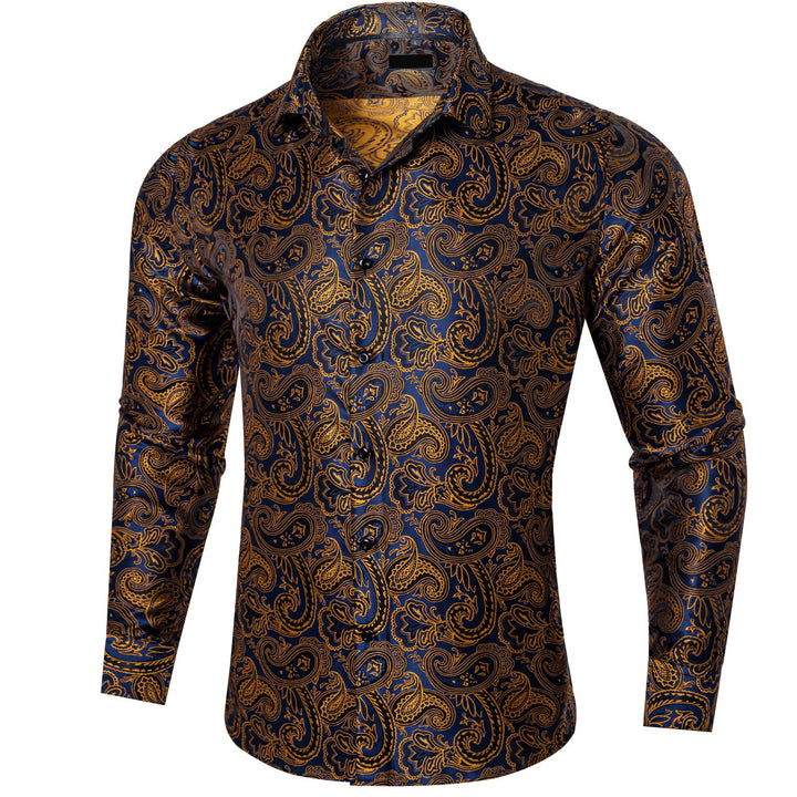 business dress suit shirt top gold navy blue paisley shirt for men