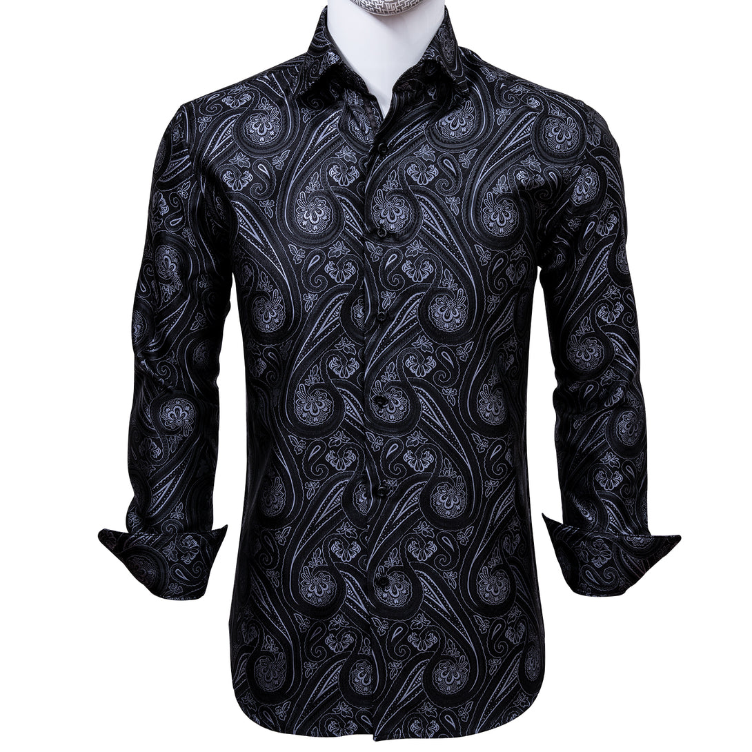 Ties2you Mens Black Western Shirt Silk Grey Paisley Long Sleeve Button Down Dress Shirt