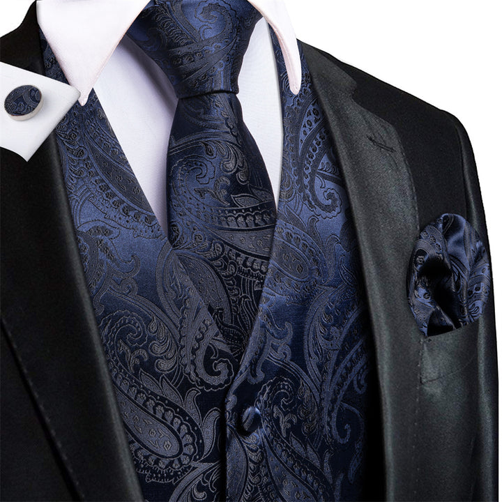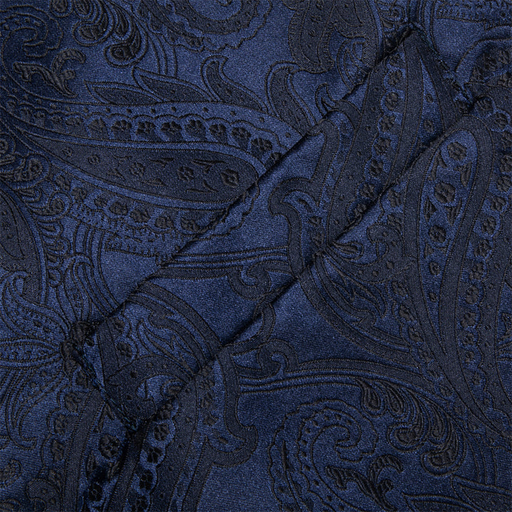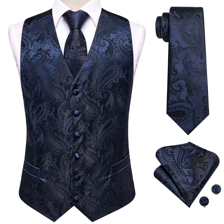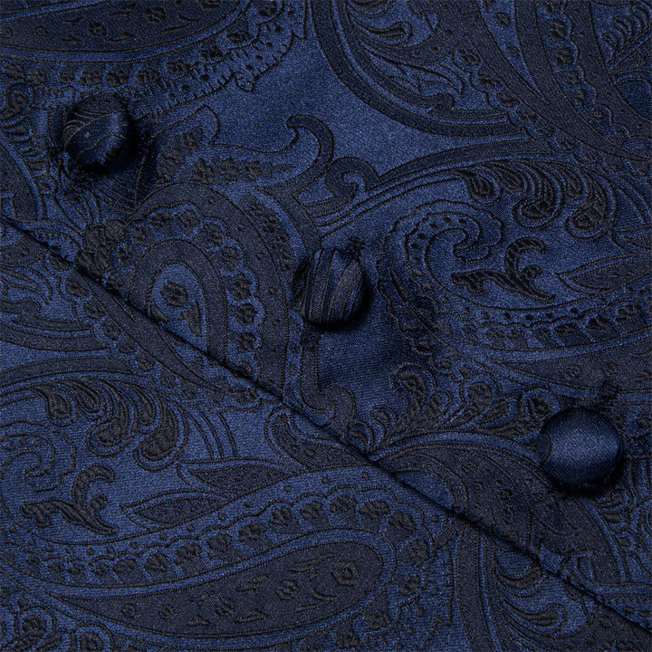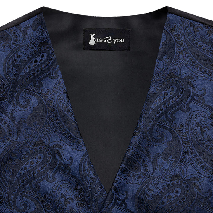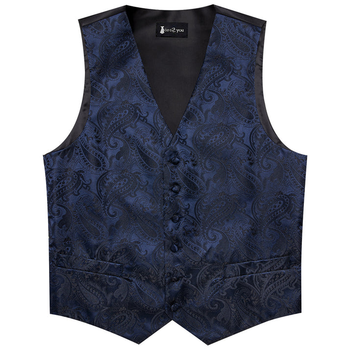 Ties2you Dark Midnight-Blue Paisley Pattern V-Neck Silk Vest Necktie Set