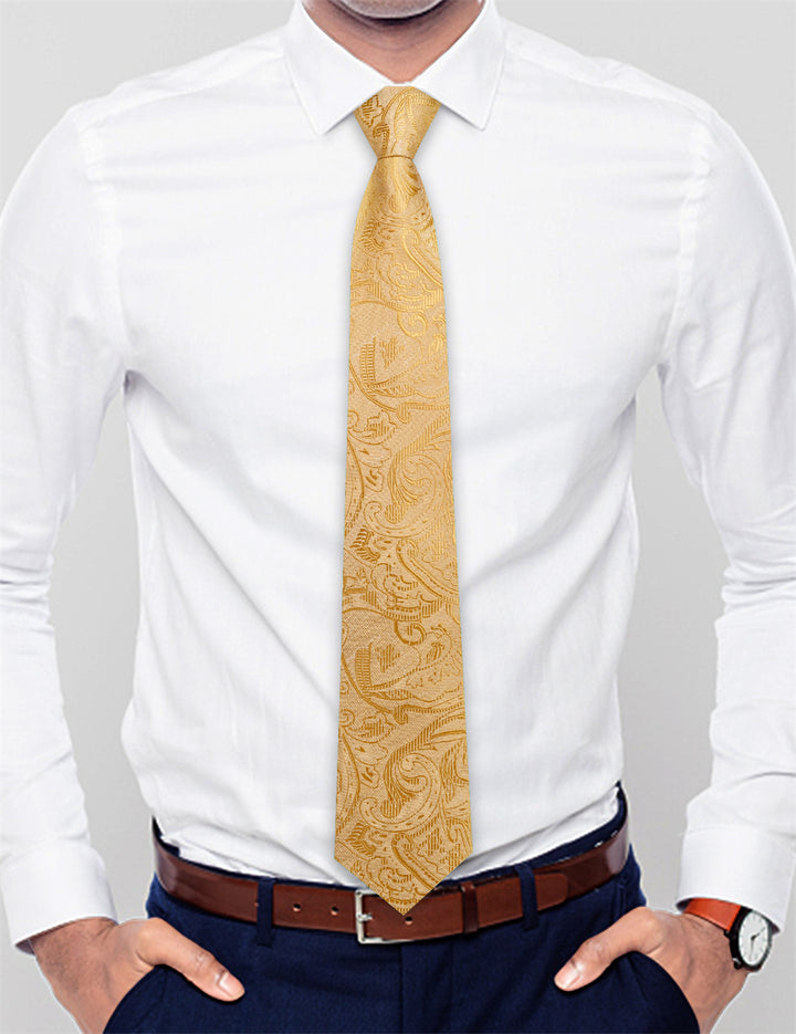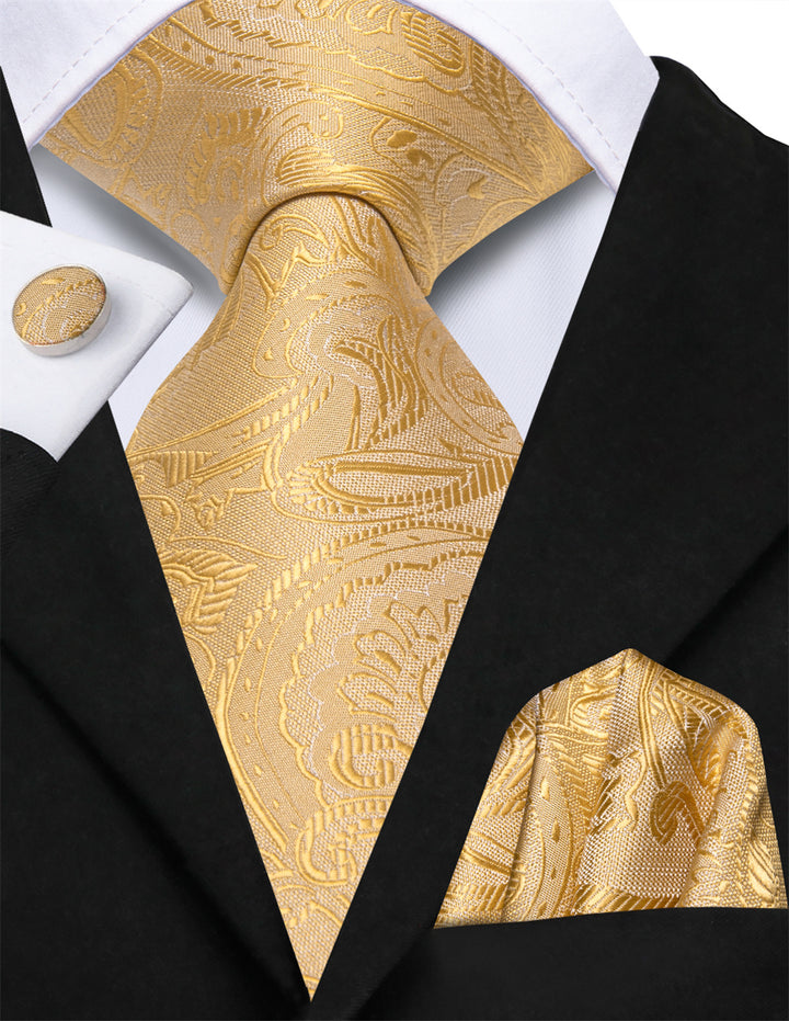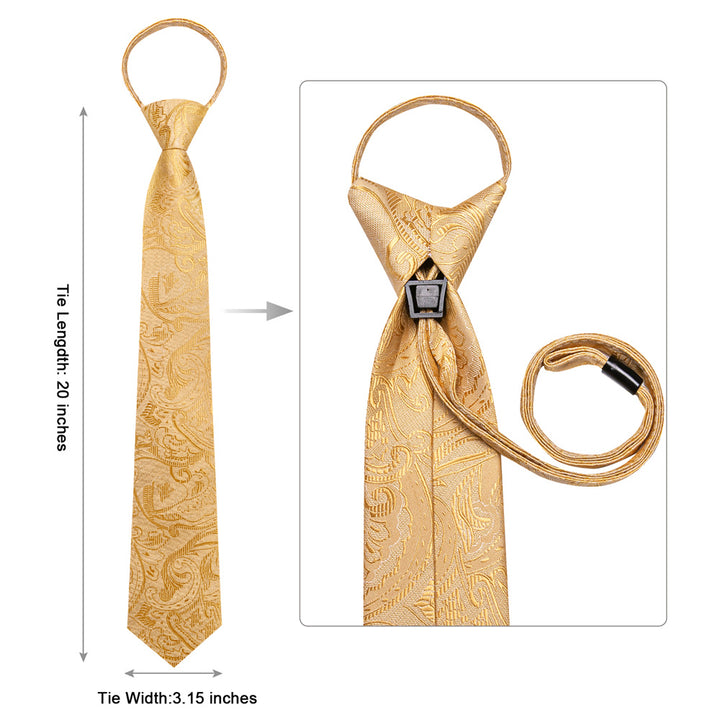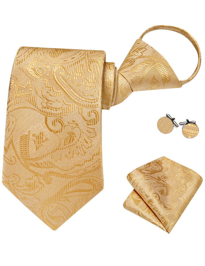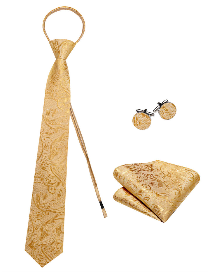 Ties2you Golden Floral Lazy Mens Easy-pull Silk Tie Pocket Square Cufflinks Set
