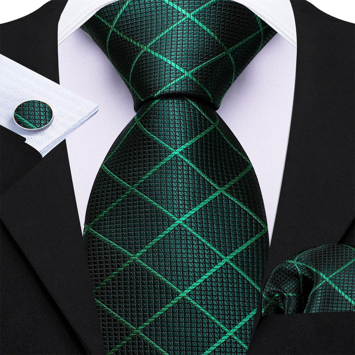 Ties2you Green Tie Pine Plaid Silk Tie Pocket Square Cufflinks Set for Office Dress