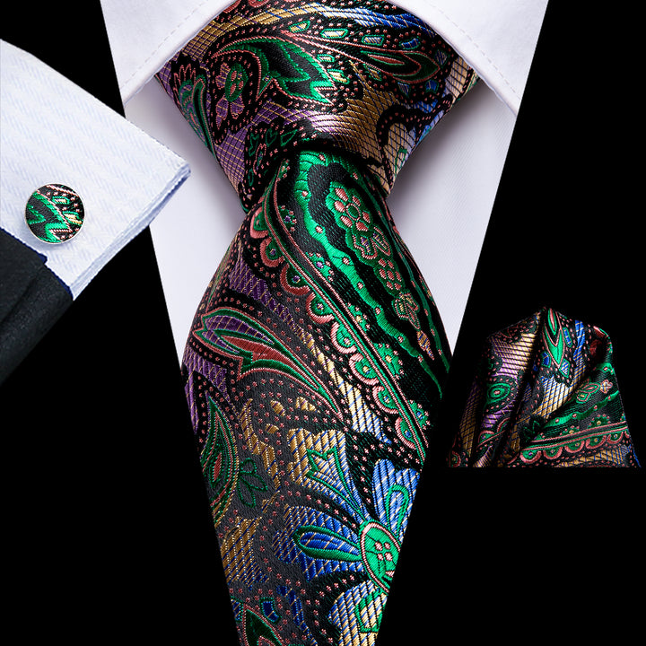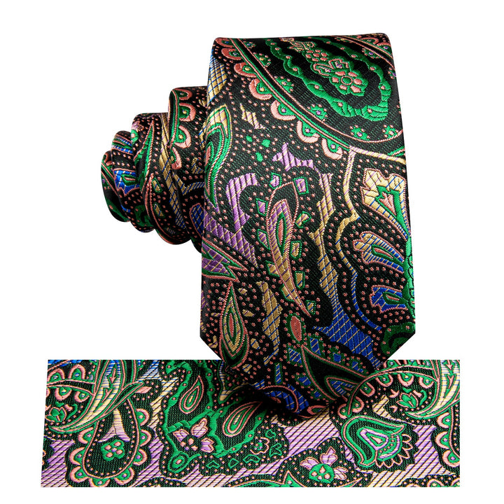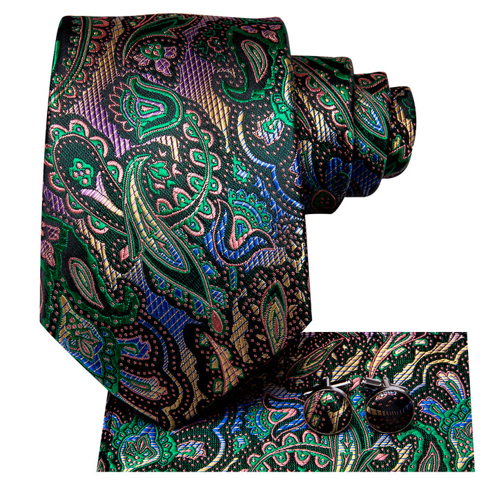 Colorful paisley green yellow pink tie pocket square cufflinks set