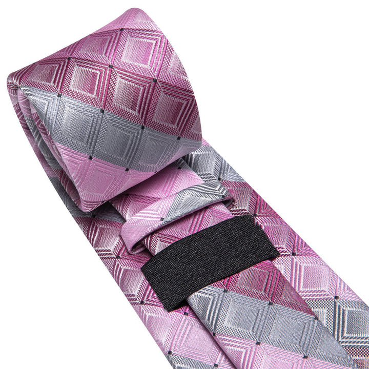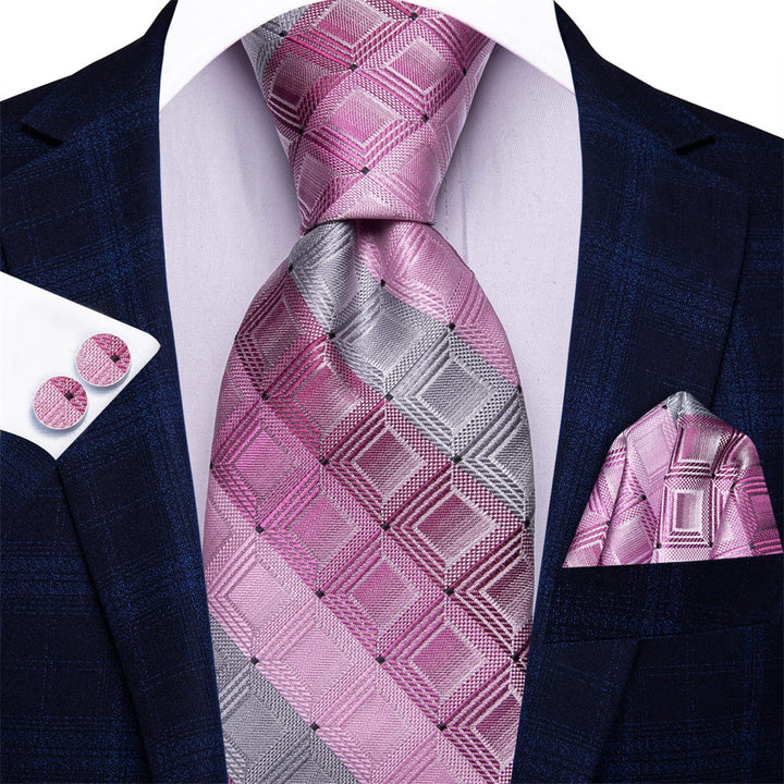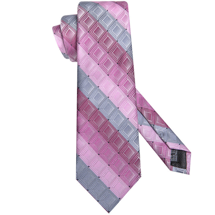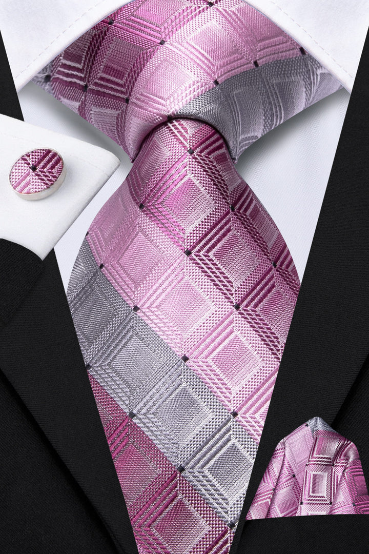 Ties2you Pink Grey Plaid Men's Silk Tie Hanky Cufflinks Set