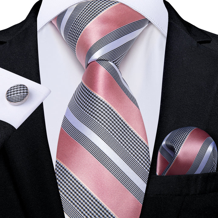 grey pink striped silk mens suit tie pocket square cufflinks with white shirt