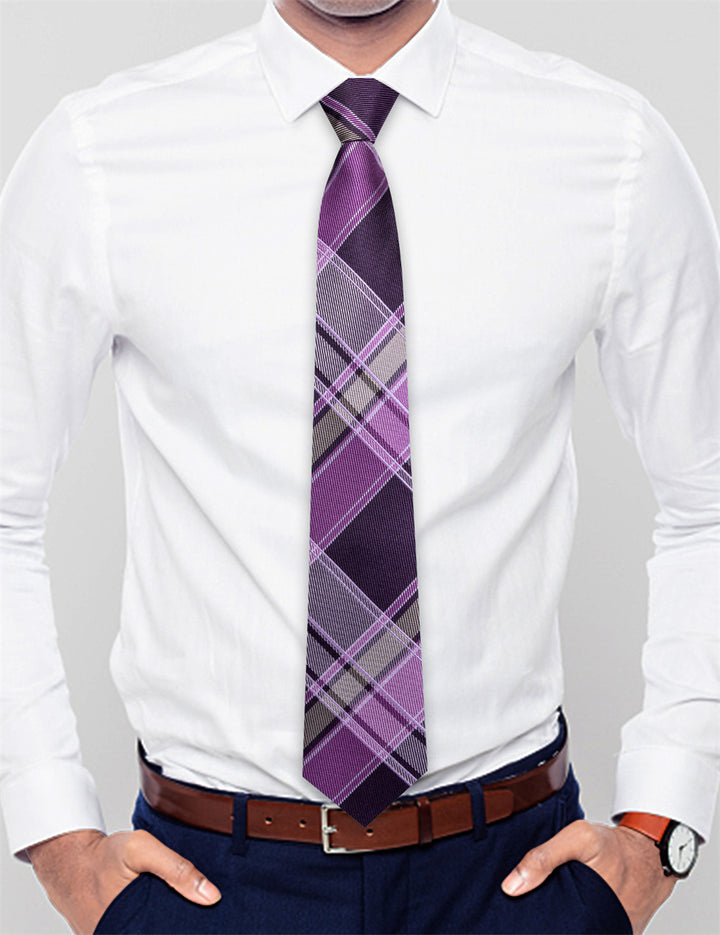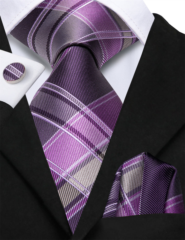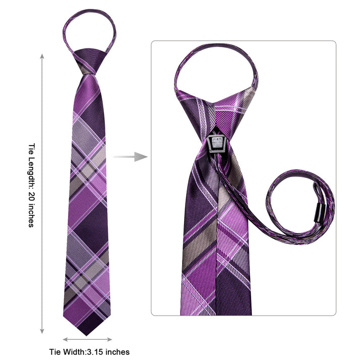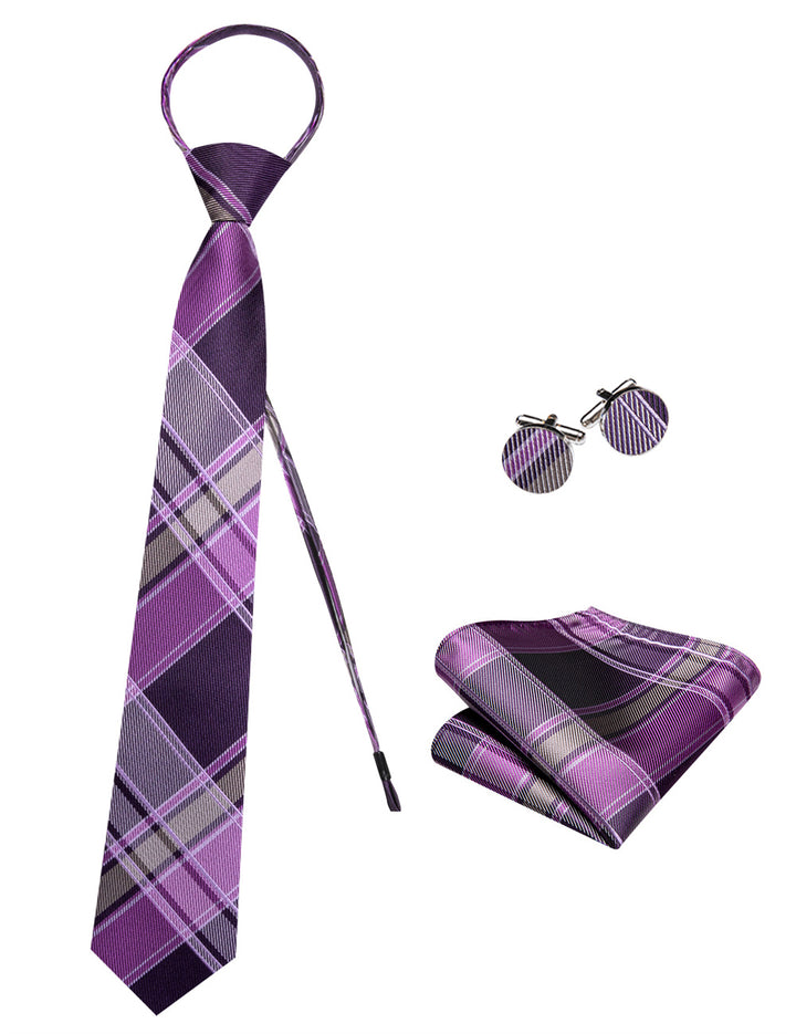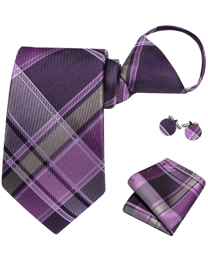 Ties2you Purple Grey Plaid Lazy Mens Easy-pull Silk Tie Pocket Square Cufflinks Set