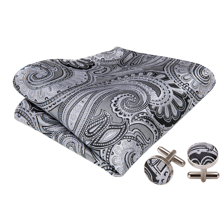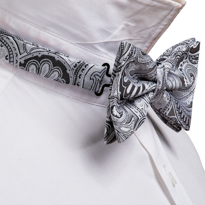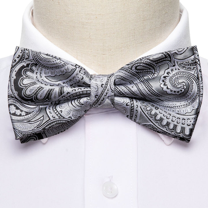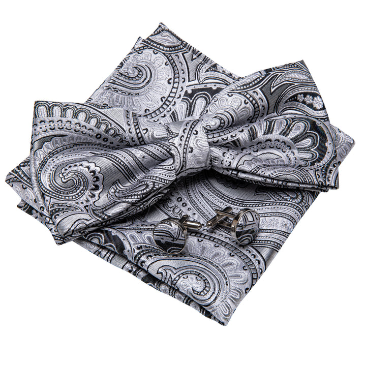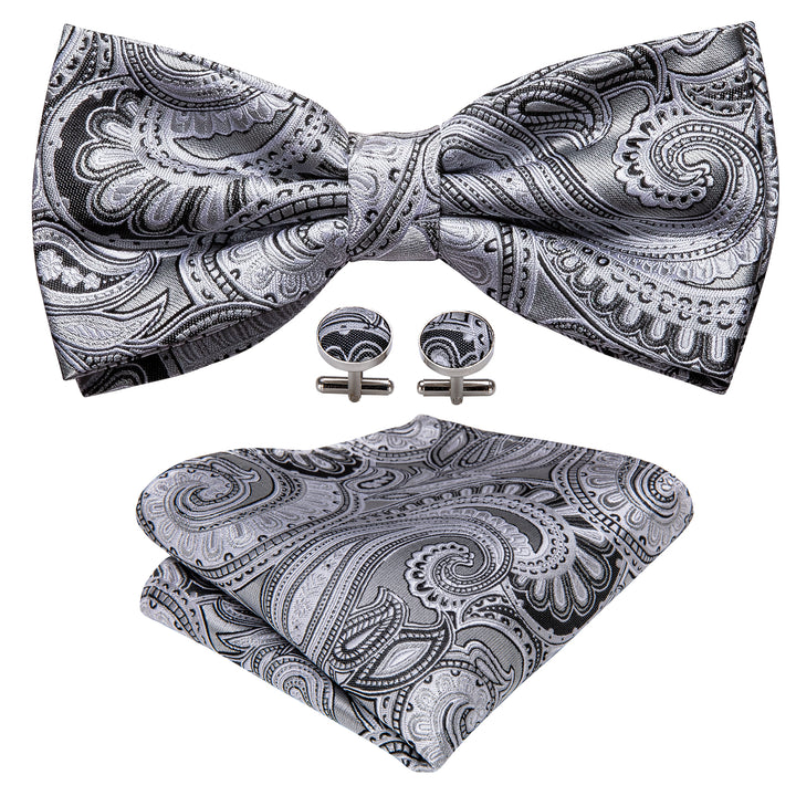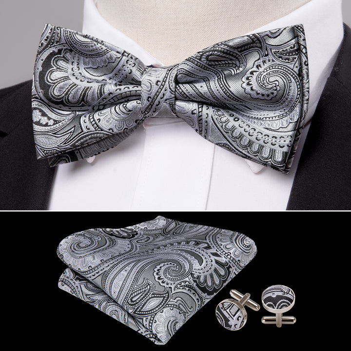 Ties2you Paisley Grey Bow Tie Pre-tied Wedding Bowtie Handkerchief Cufflinks Set for Men