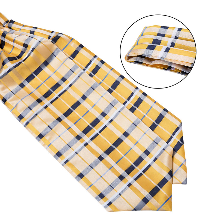 Yellow Blue Striped Silk Cravat Woven Ascot Tie Pocket Square Handkerchief Set